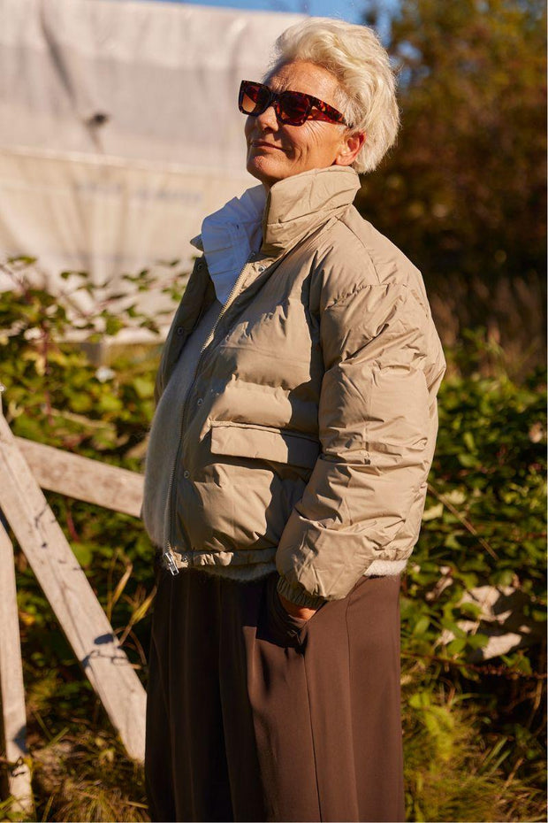 Cool kort puffet jakke med krave og lommer. Jakken har lynlås og trykknapper på fronten, så den kan holde kulden ude. Derudover har den justerbare snore i bunden, så der ikke kommer vind op under, samt manchetter ved ærmerne.