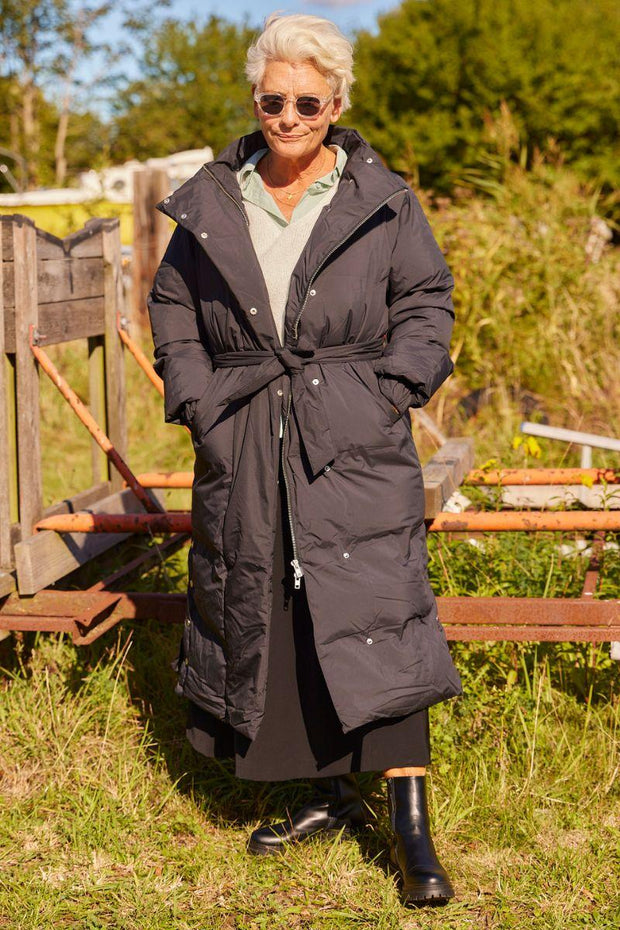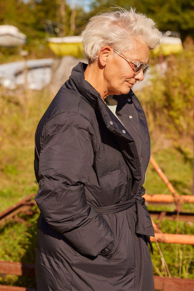 Skøn lang puffet jakke med krave og lommer. Jakken har lynlås og trykknapper på fronten, så den kan holde kulden ude, samt manchetter ved ærmerne. Den har bindebånd i taljen, der giver en lækker pasform, samt knapper i siden for at kunne give optimal bevægelighed.
