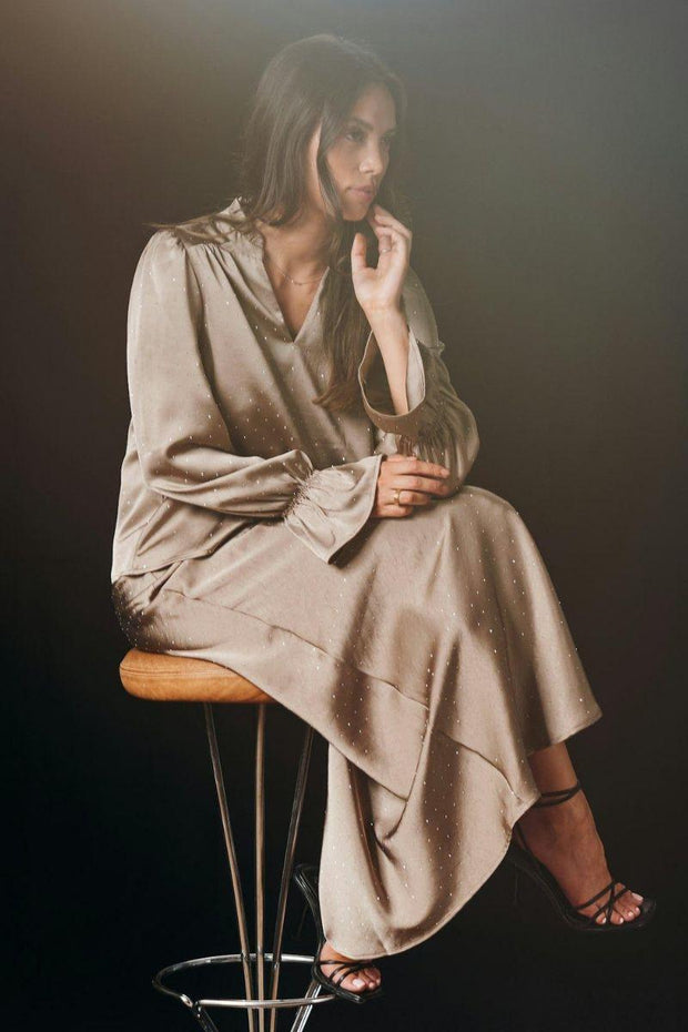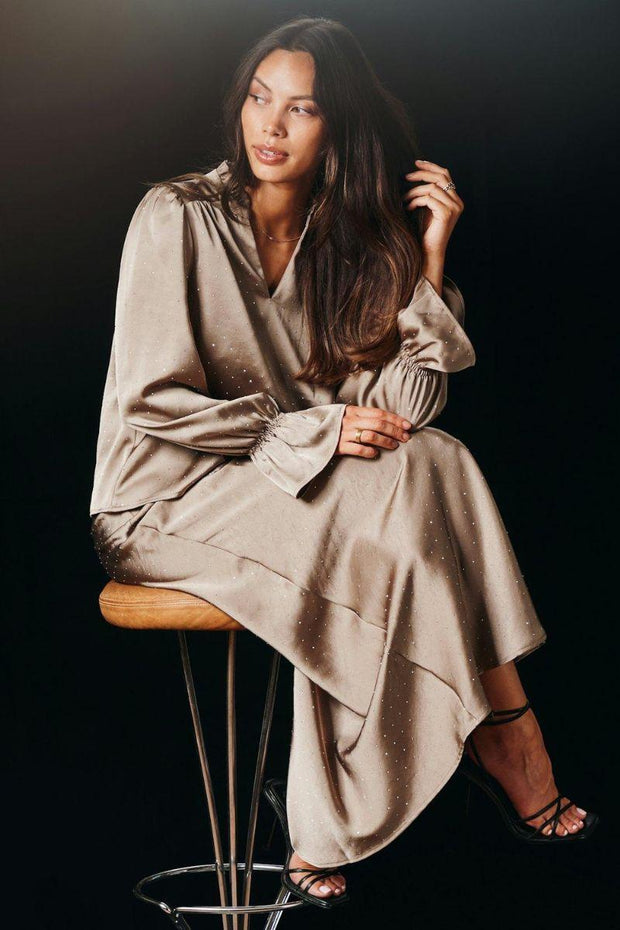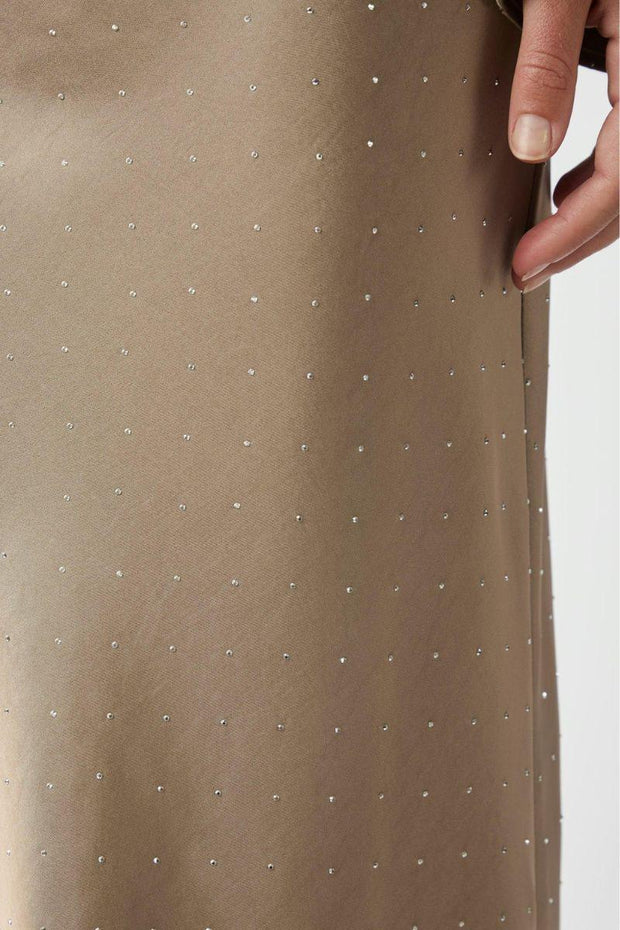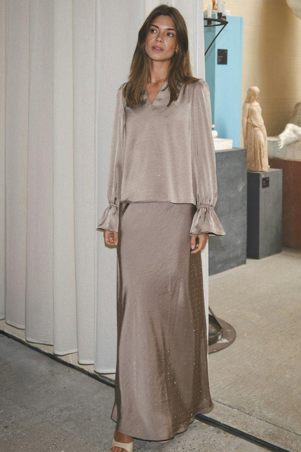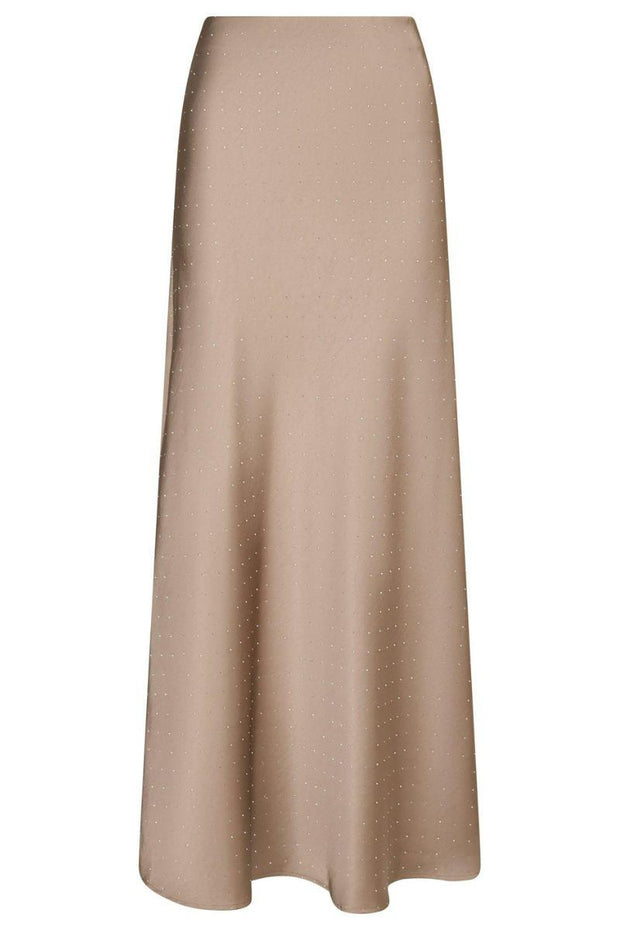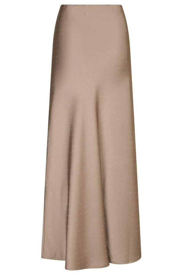 Lang nederdel med elastik indvendig i taljen. Nederdelen er skåret på skrå og følger kroppen og falder smukt. Kvaliteten er en lækker satin med sten. Modellen er 176 cm og bærer en størrelse 36