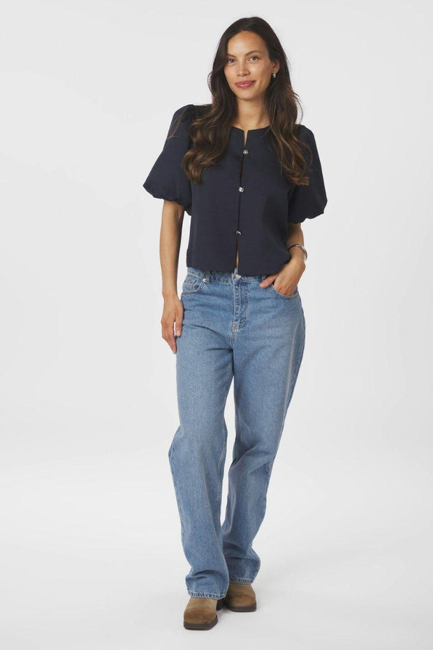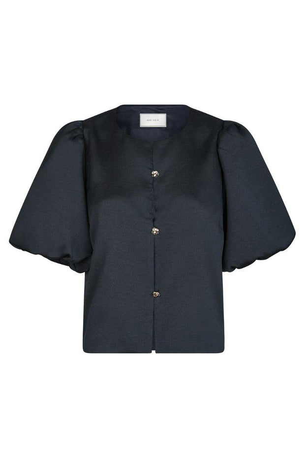 Fin bluse med pufærmer og knappelukning foran til, kan også blivebrugt som en lille jakke. Modellen er 176cm og bærer en størrelse 36.