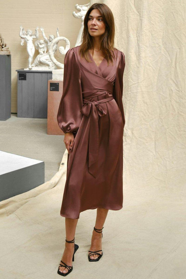 Smuk kjole med slå-om detalje i taljen som gør kjolen endnu mere feminin. Kjolen kommer i en nice kraftig satin kvalitet. Modellen er176 cm og bærer en størrelse 36.