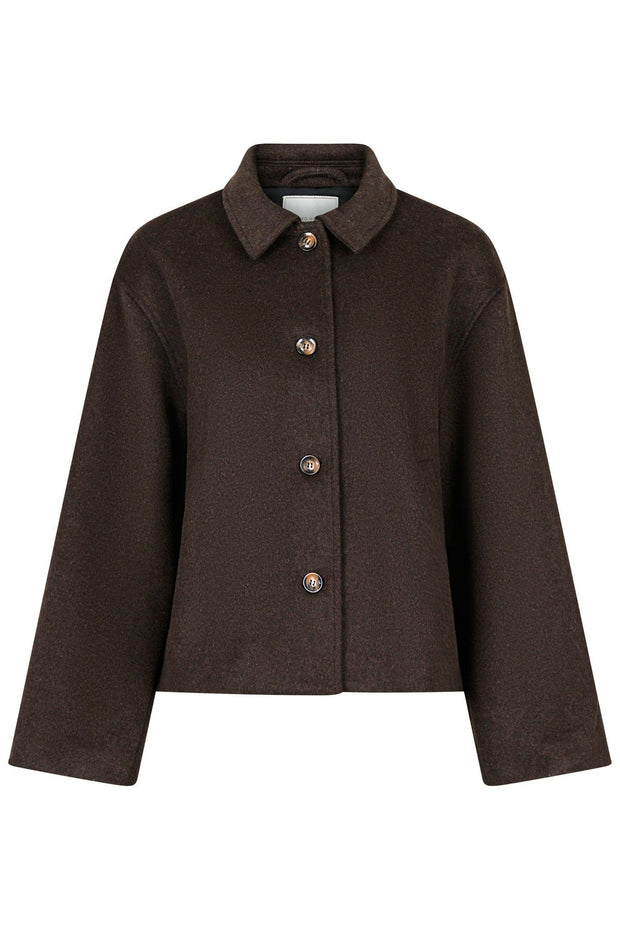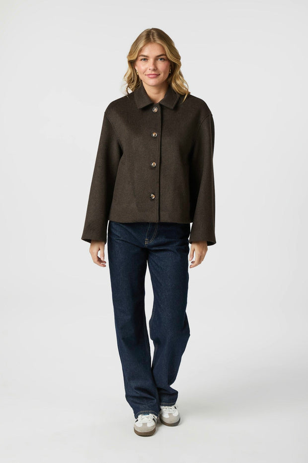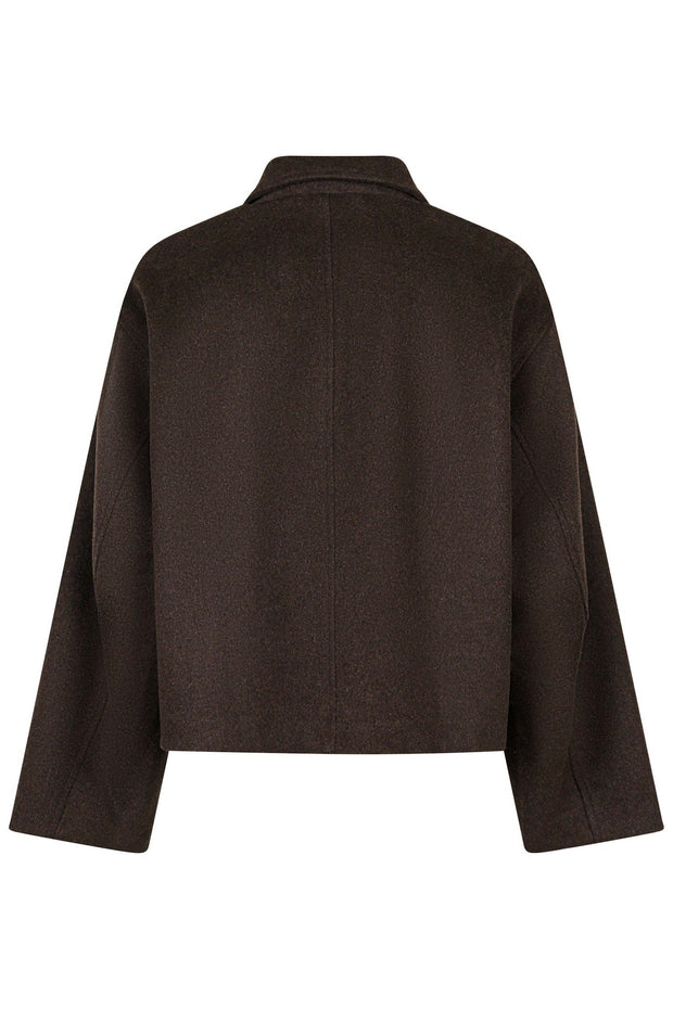 Cool uld jakke med et boxy look. Jakken har et afslappet look medlommer foran. Modellen er 176 cm og bærer en størrelse 36.