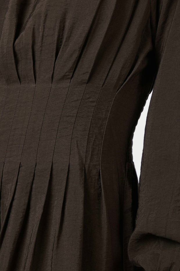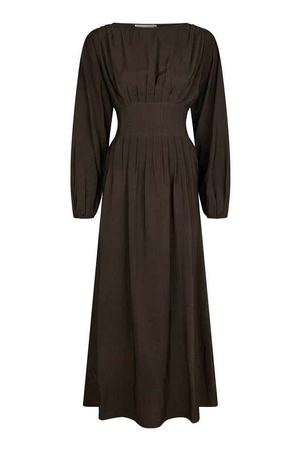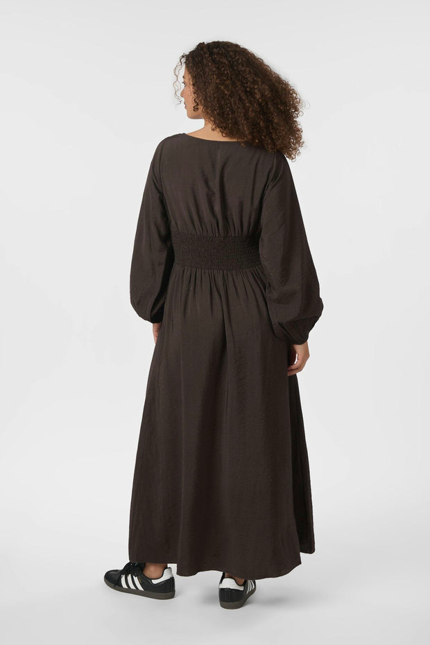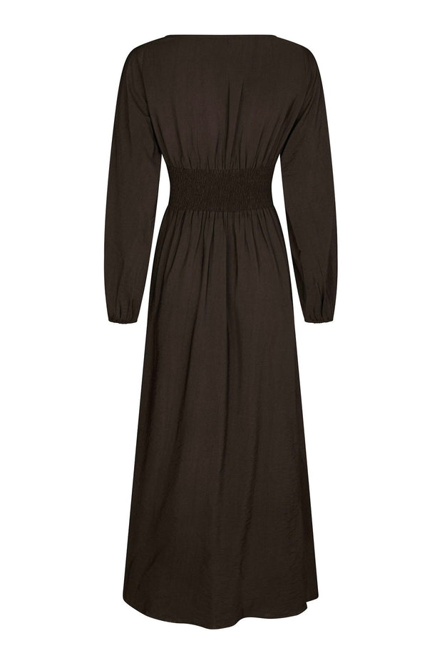 Fin langærmet kjole med en masse læg i taljen. Bagpå er der smock så den er komfortable at have på, og halsen har en feminin bådudskæring. Modellen er 176 cm og er iført en str. 36.