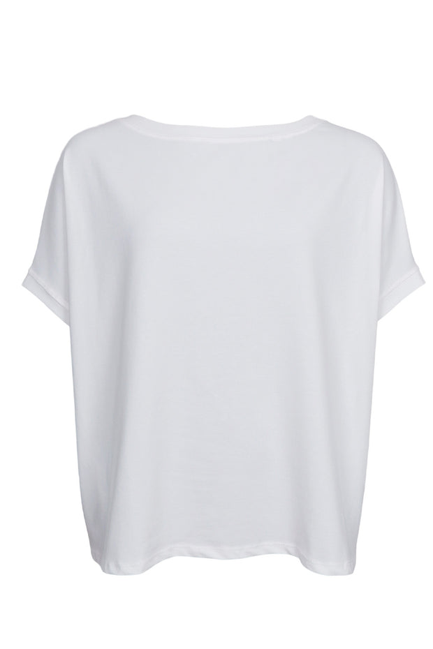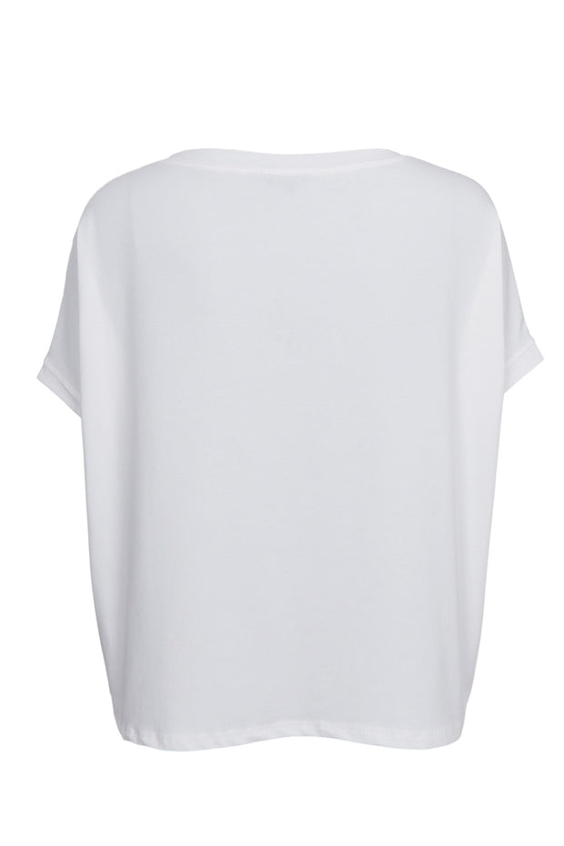 Løs bluse med korte ærmer. Mål S/M: Brystvidde: 68 cm. Længde: 62 cm. Materiale: 90% bomuld, 90% elastan