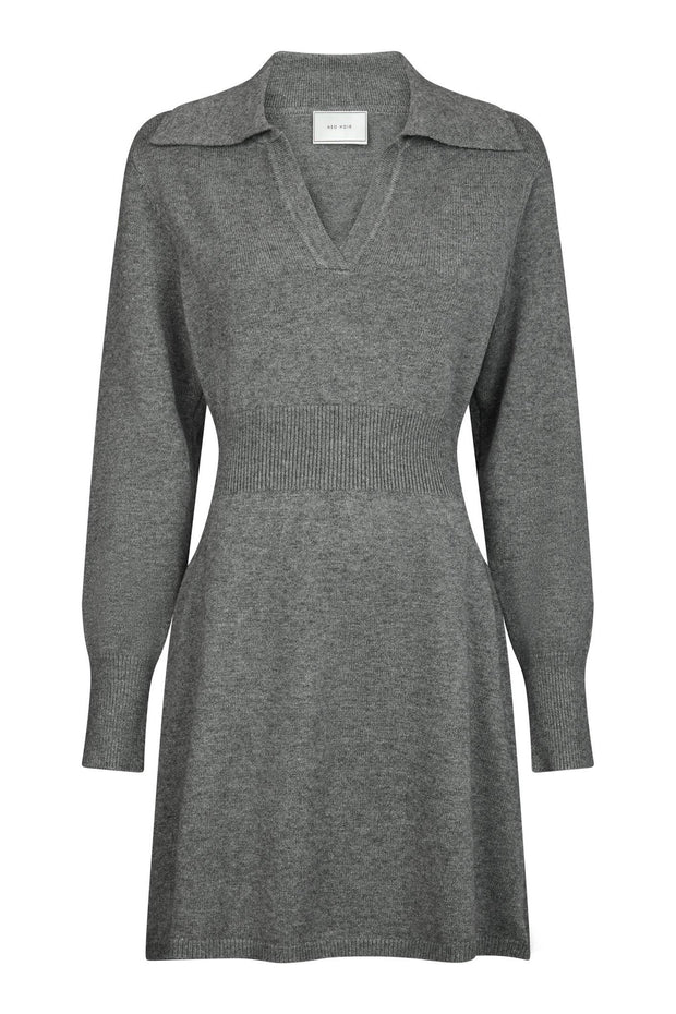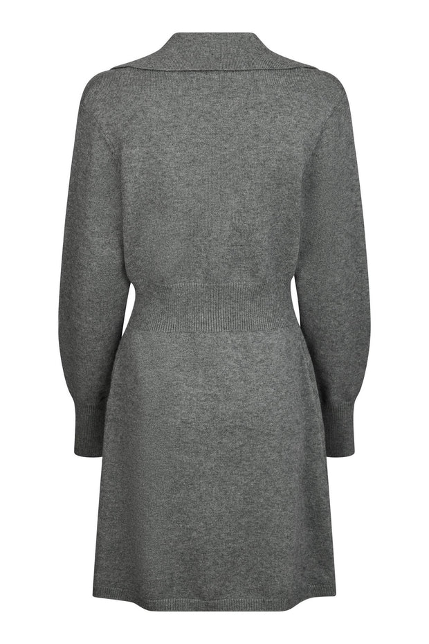 Fin strikkjole med ribdetaljer ved kraven, taljen samt kanten af ærmerne og skørtet. Kjolen er tætsiddende i taljen og ved ærmekanten, mens den ellers har en løstsiddende pasform. Modellen er 176 cm og bærer en størrelse 36.
