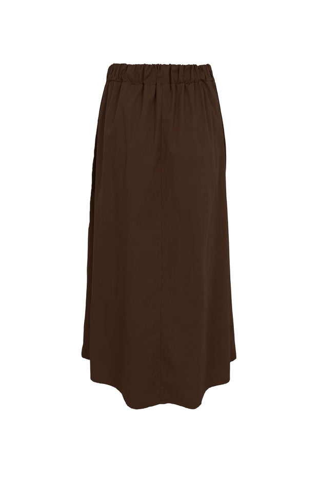 A-formet nederdel med lommer og bæltestropper. Elastik i taljen. Mål S/M: ½ talje (afslappet): 33 cm. ½ talje (strakt): 54 cm. Længde: 86 cm. Materiale: 100% bomuld