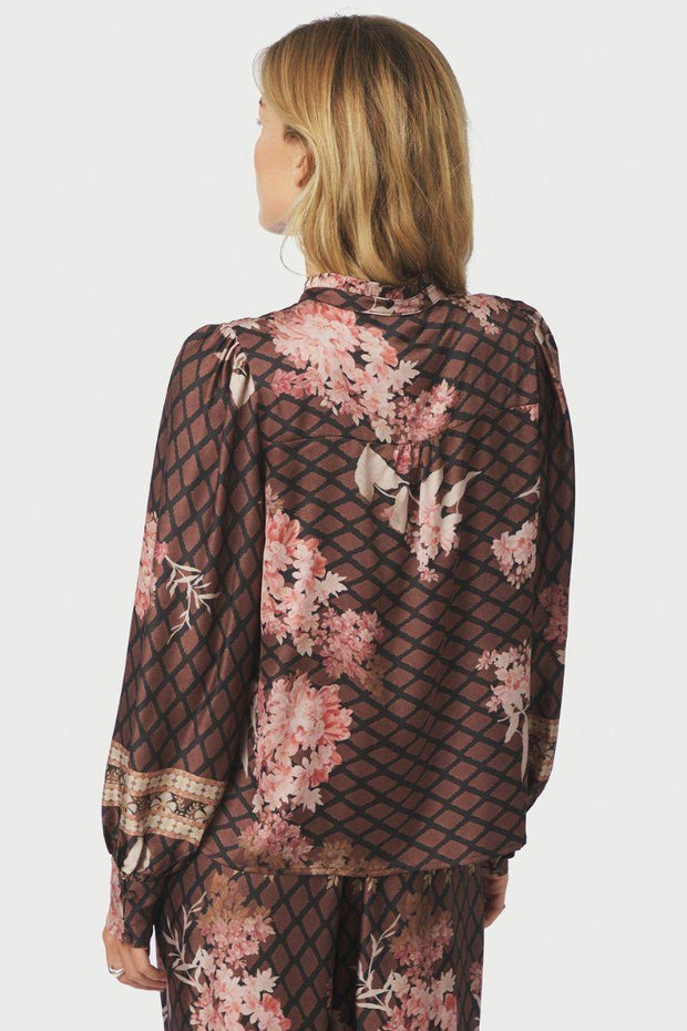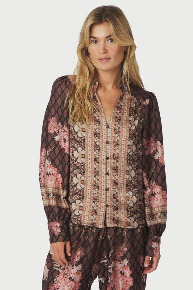 Feminin bluse med et smukt grafisk og blomster print. Blusen har lange ærmer og går ned i et V foran med dekorative knapper.