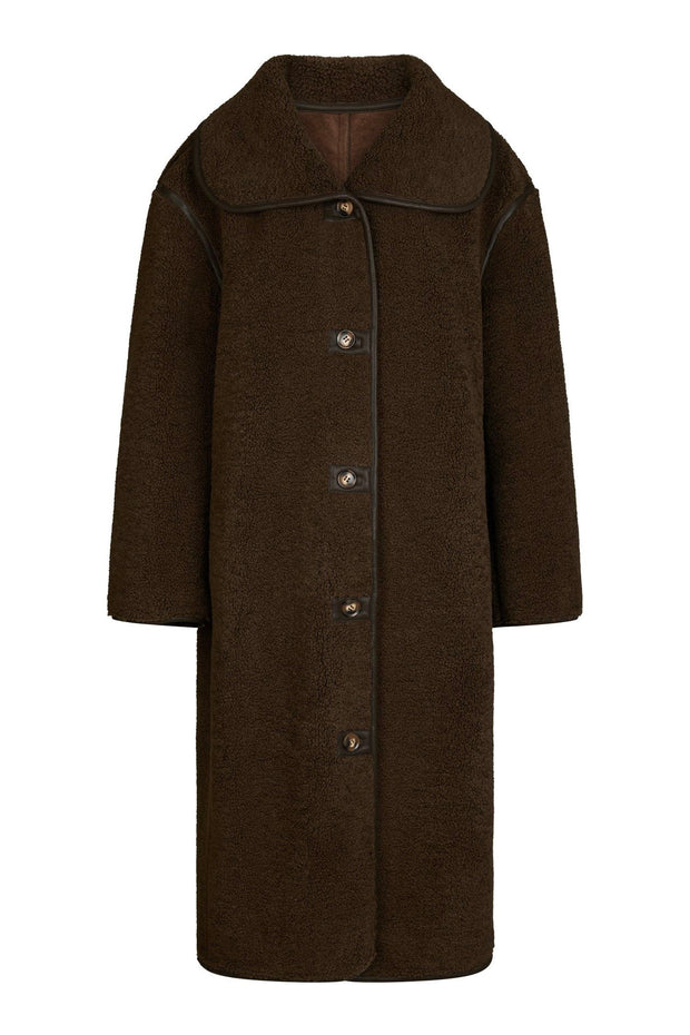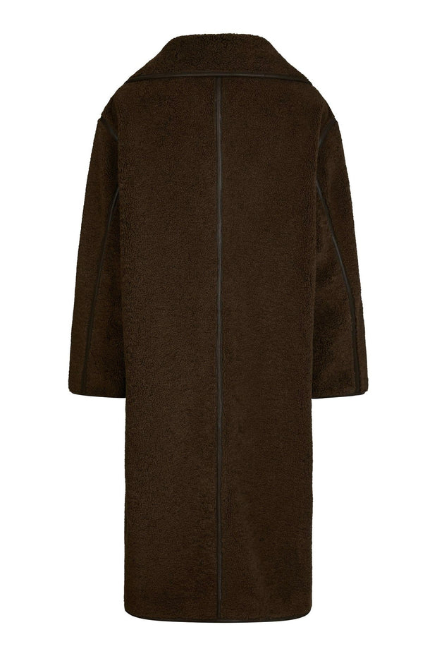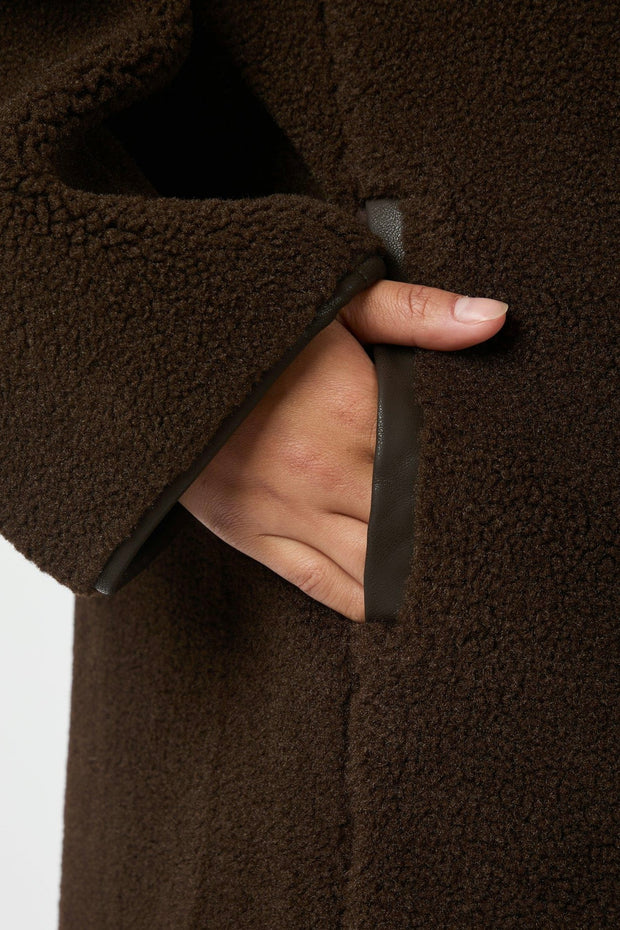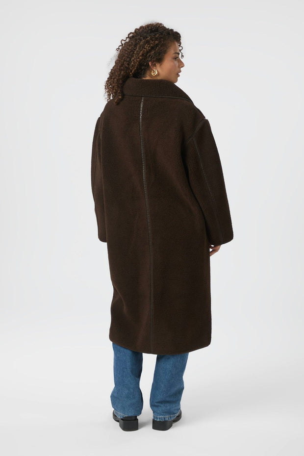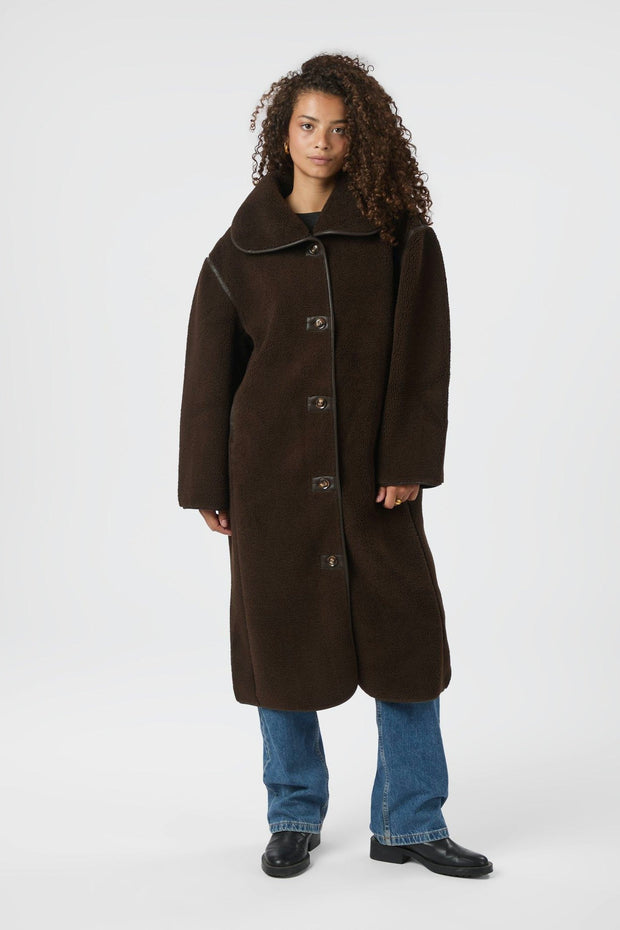 Cool loose-fit frakke i teddy-materiale. Jakken har knappelukning og flotte faux leather-detaljer. Modellen er 176 cm og bærer en størrelse 36.