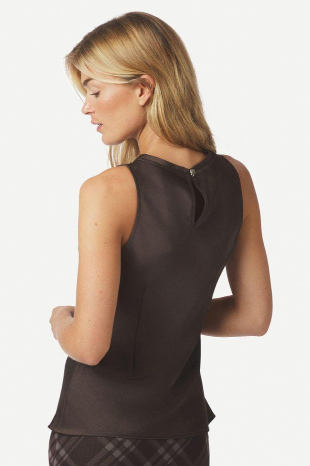 Elegant top i en kraftig satin kvalitet. Toppen lukkes ved nakken. Modellen er 176cm høj og er iført størrelse 36.