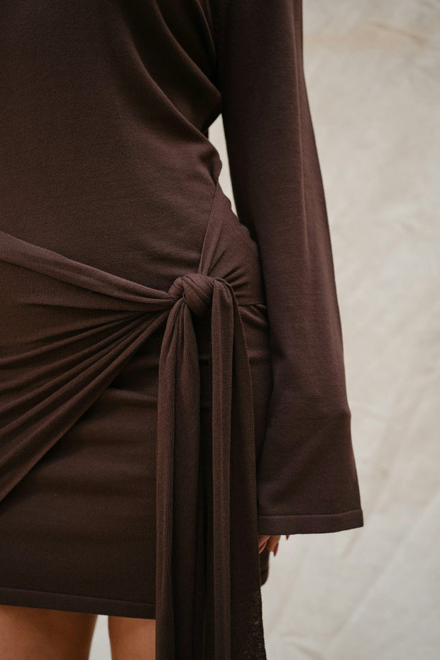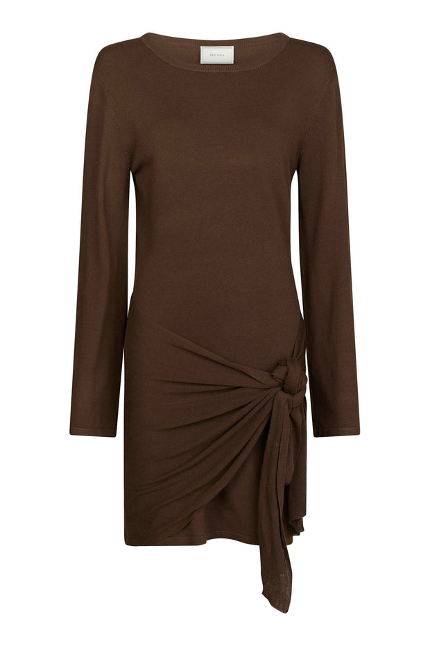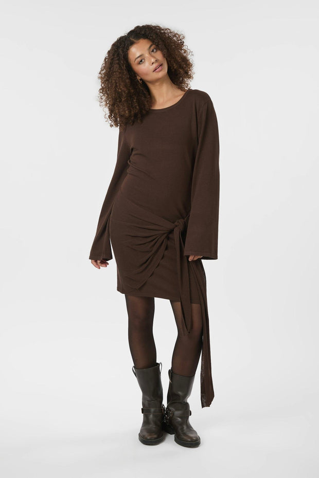 Strikket kjole med bindebånd effekt ved hoften. Kjolen har lange ærmer med vidde Modellen er 176 cm og bærer en størrelse 36
