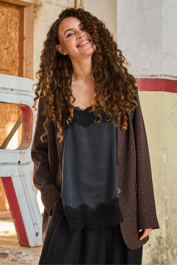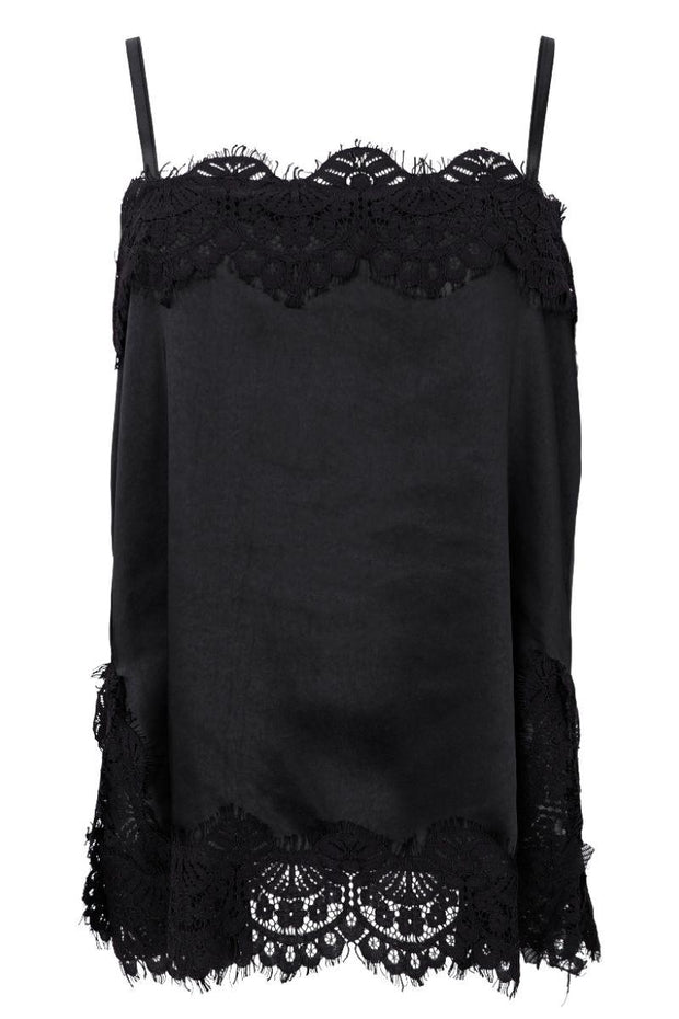 Top med satinstropper og blonde.