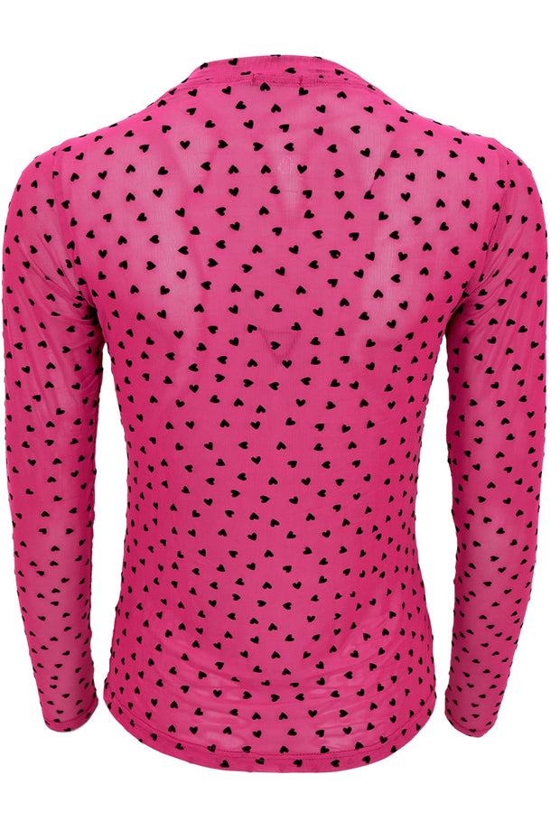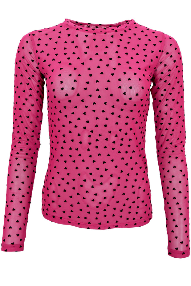 Netbluse med hjerter i flockprint over det hele. Mål S/M½ Bryst: 35 cm. Længde: 63 cm. Sammensætning: 95% polyester, 5% spandex