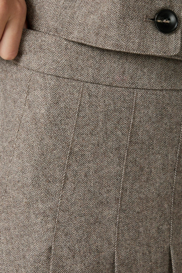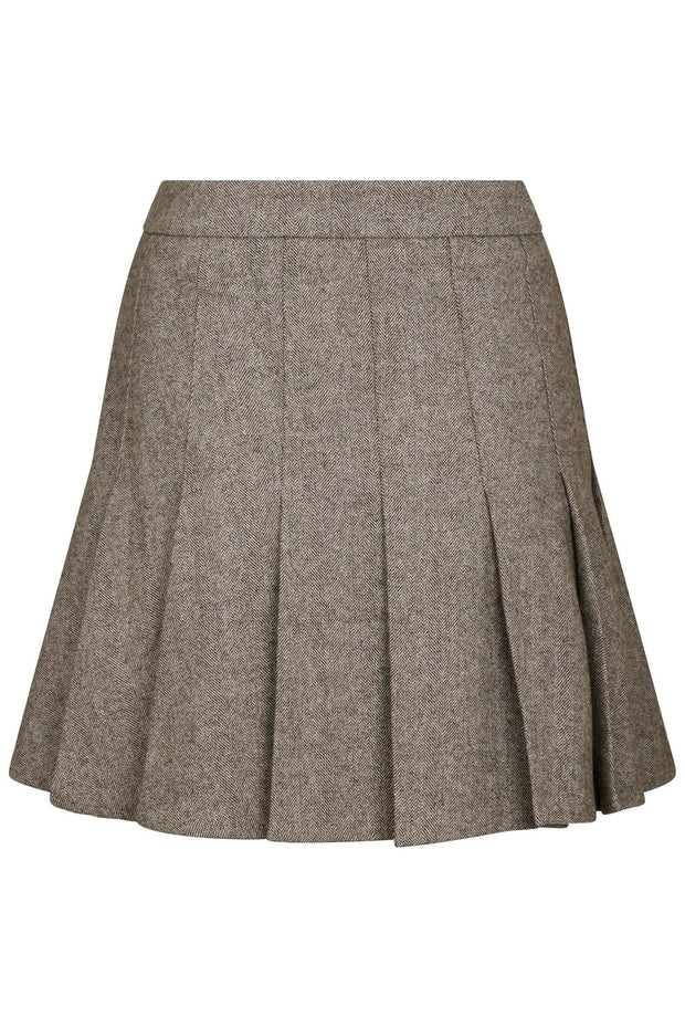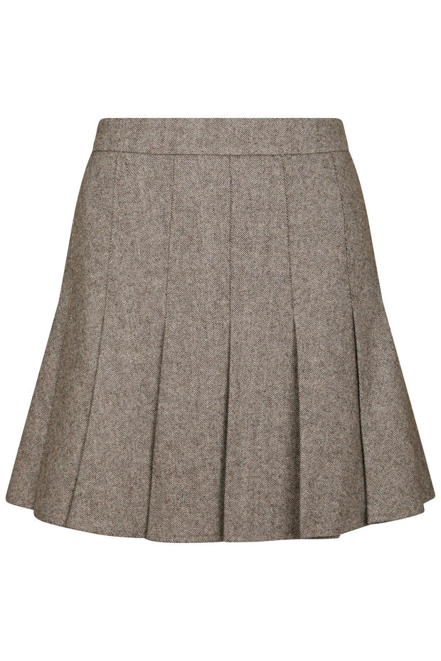 Fin kort nederdel med brede plisseringer. Nederdelen har skjult en lynlås og kommer i en lækker uldmix kvalitet. Modellen er 176cm og bærer en størrelse 36