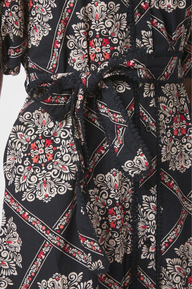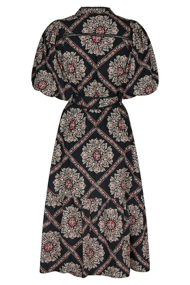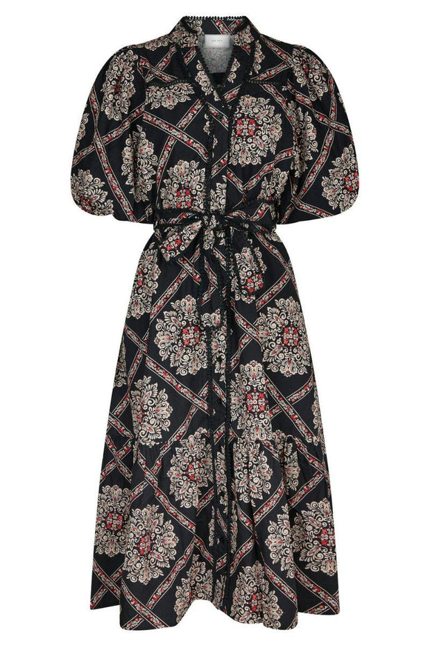 Fin skjortekjole med høj flæse forneden og store pufærmer. Kjolen kommer i en skøn bomuldskvalitet med et grafisk print, og kantbånds detaljer. Modellen er 176cm og er iført en størrelse 36.