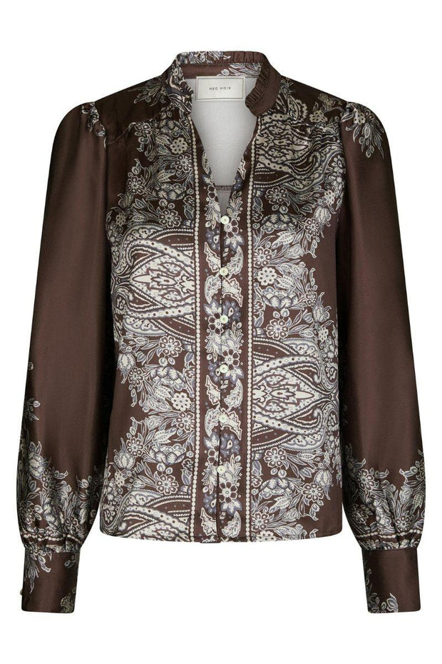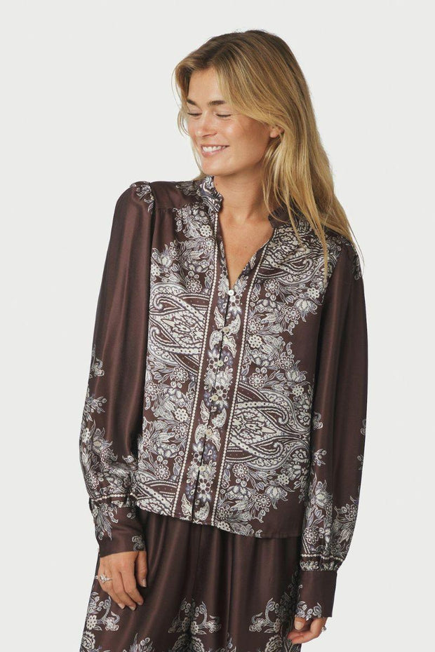 Feminin bluse med et smukt paisley print. Blusen har lange ærmer og går ned i et V foran med dekorative knapper.